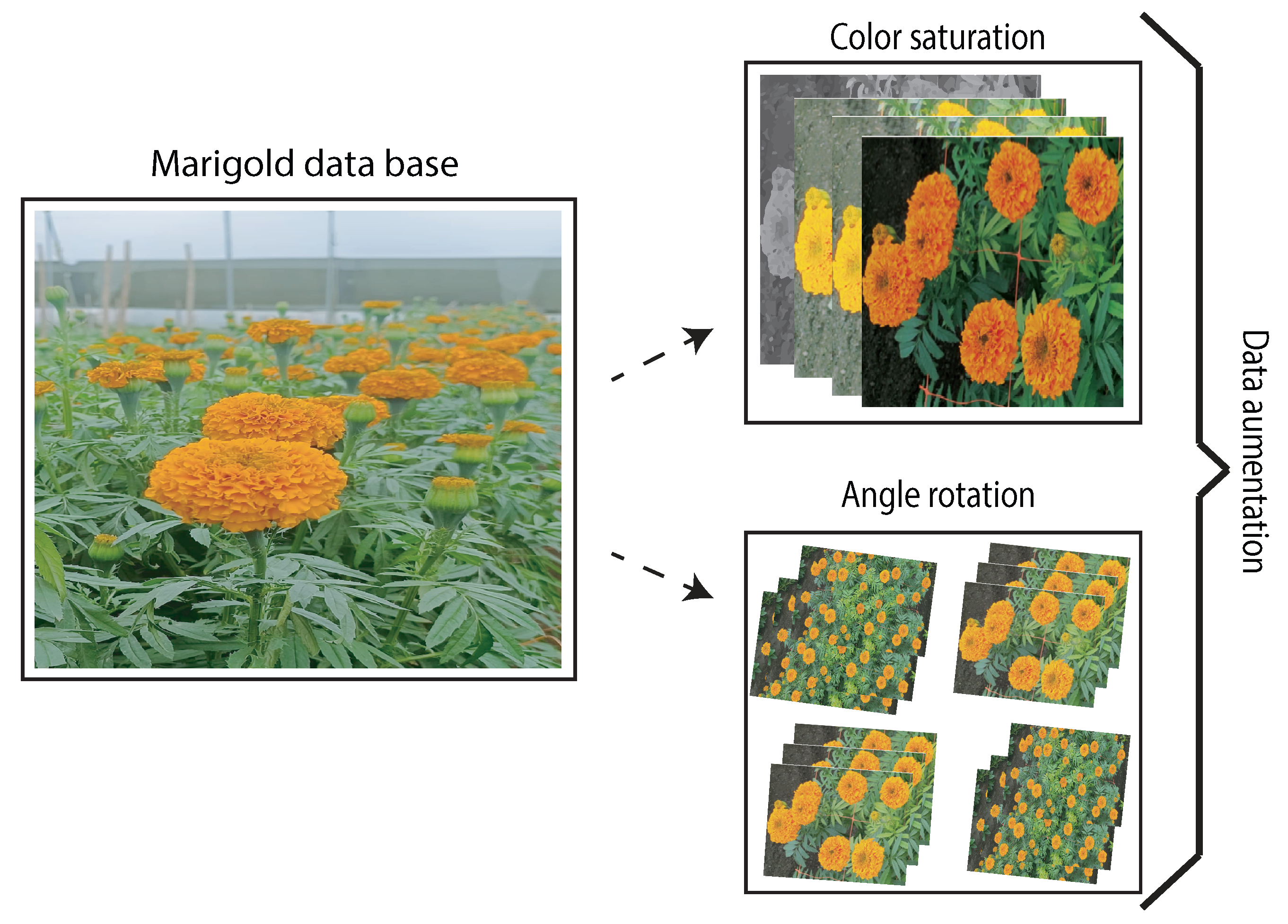 The dataset comprised 392 original images of marigold crops from various angles, with an initial resolution of 1280 × 720 pixels. To increase variability and reduce overfitting, data augmentation techniques were applied exclusively to the training set, as detailed in Table 2.