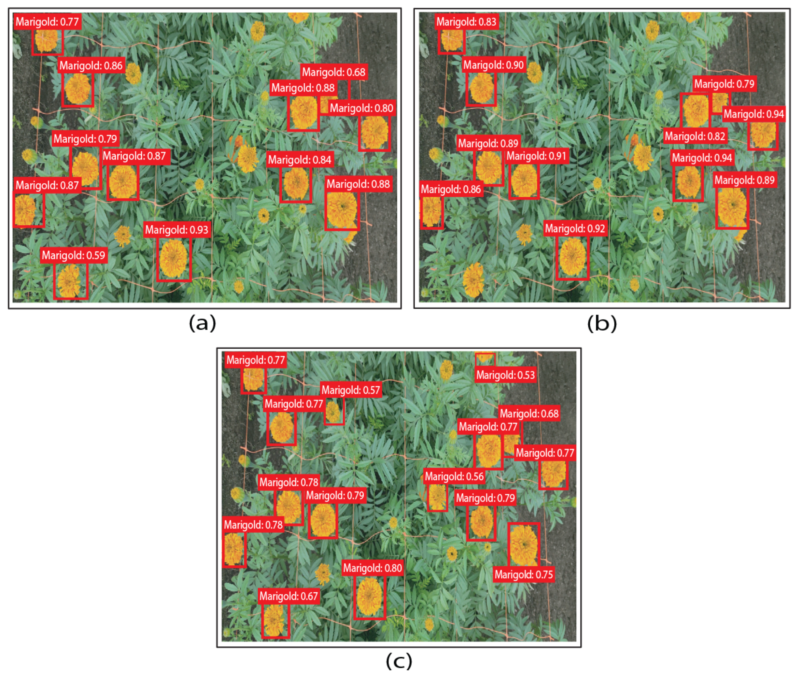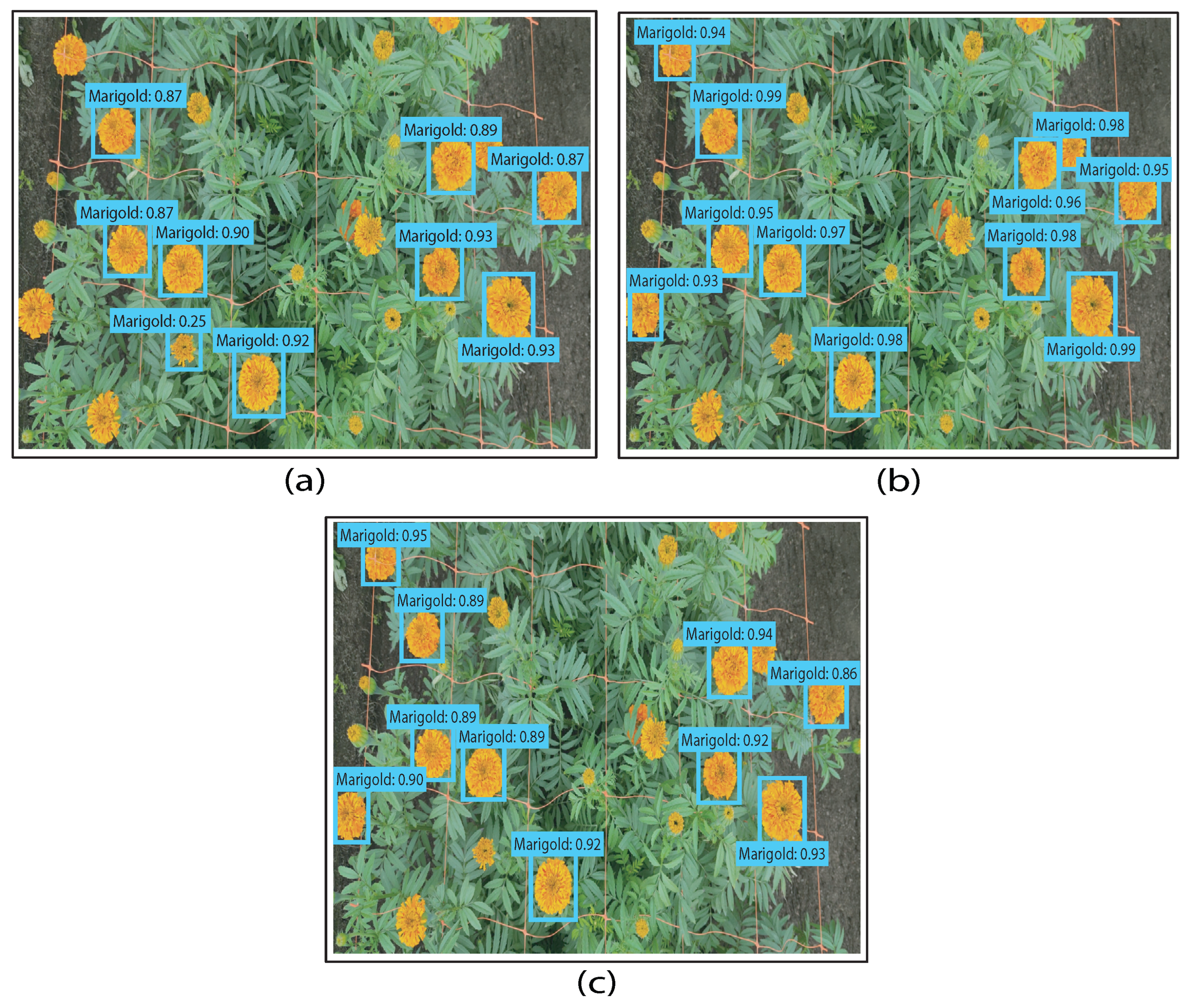 The main hyperparameter exploration was carried out on the modified versions of YOLOv2, SSD, and Faster R-CNN, where we tested three optimizers: Stochastic Gradient Descent with Momentum (SGDM), Adaptive Moment Estimation (Adam), and Root Mean Square Propagation (RMSProp), and three learning rates (0.001, 0.0001, 0.0005). The specific experimental configurations are summarized in Table 7. SGDM with momentum (0.9) was included as the baseline, since it is the same optimizer originally applied in Faster R-CNN, SSD, and YOLOv2 [35,49,50]. Adam was also tested because it usually provides stable training when the dataset is small, as it adapts the learning rate for each parameter and often speeds up convergence [51]. RMSProp was considered because it tends to improve stability when the data show changes in object size or illumination [52], which is the case for our marigold images. This setup allowed us to keep the canonical and modern detectors faithful to their standard training conditions, while at the same time performing a controlled sensitivity analysis on the modified versions. In this way, we were able to evaluate the impact of different optimizers and learning rates without altering the reproducibility of the baseline models. Testing multiple hyperparameter configurations in the modified detectors also helped us identify cases of overfitting and underfitting, strengthening the reliability of the reported results [53].