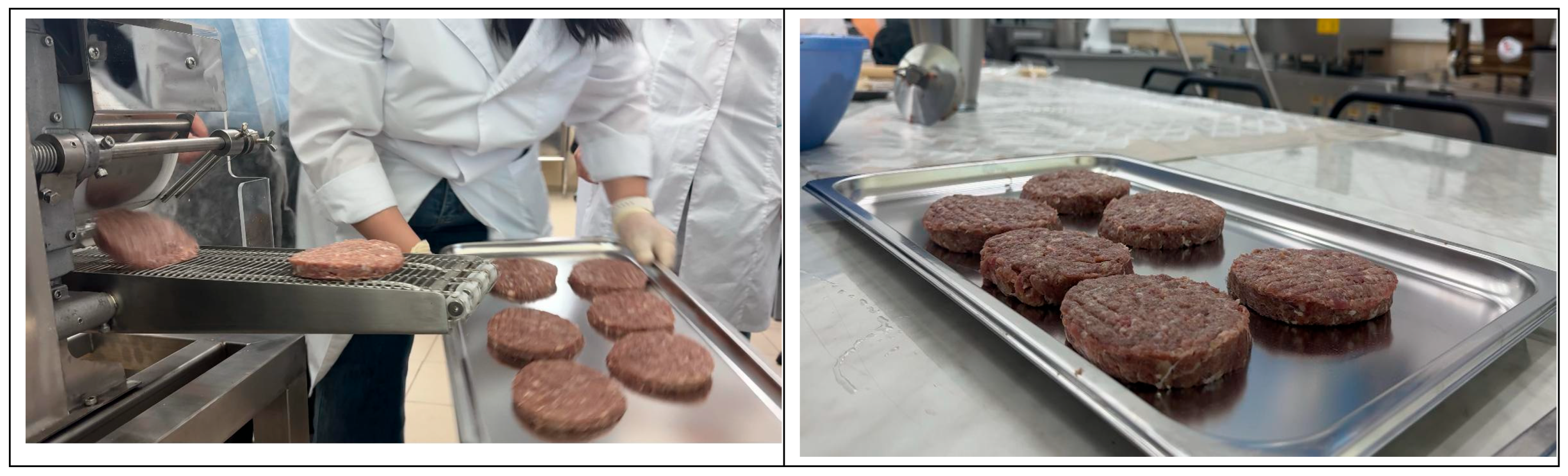 The ground meat was then combined with non-meat ingredients (including cereal supplement), pre-weighed spices, and chilled water. All components were loaded into a laboratory meat mixer and mixed thoroughly for 3–5 min to obtain a uniform forcemeat with cohesive binding properties.