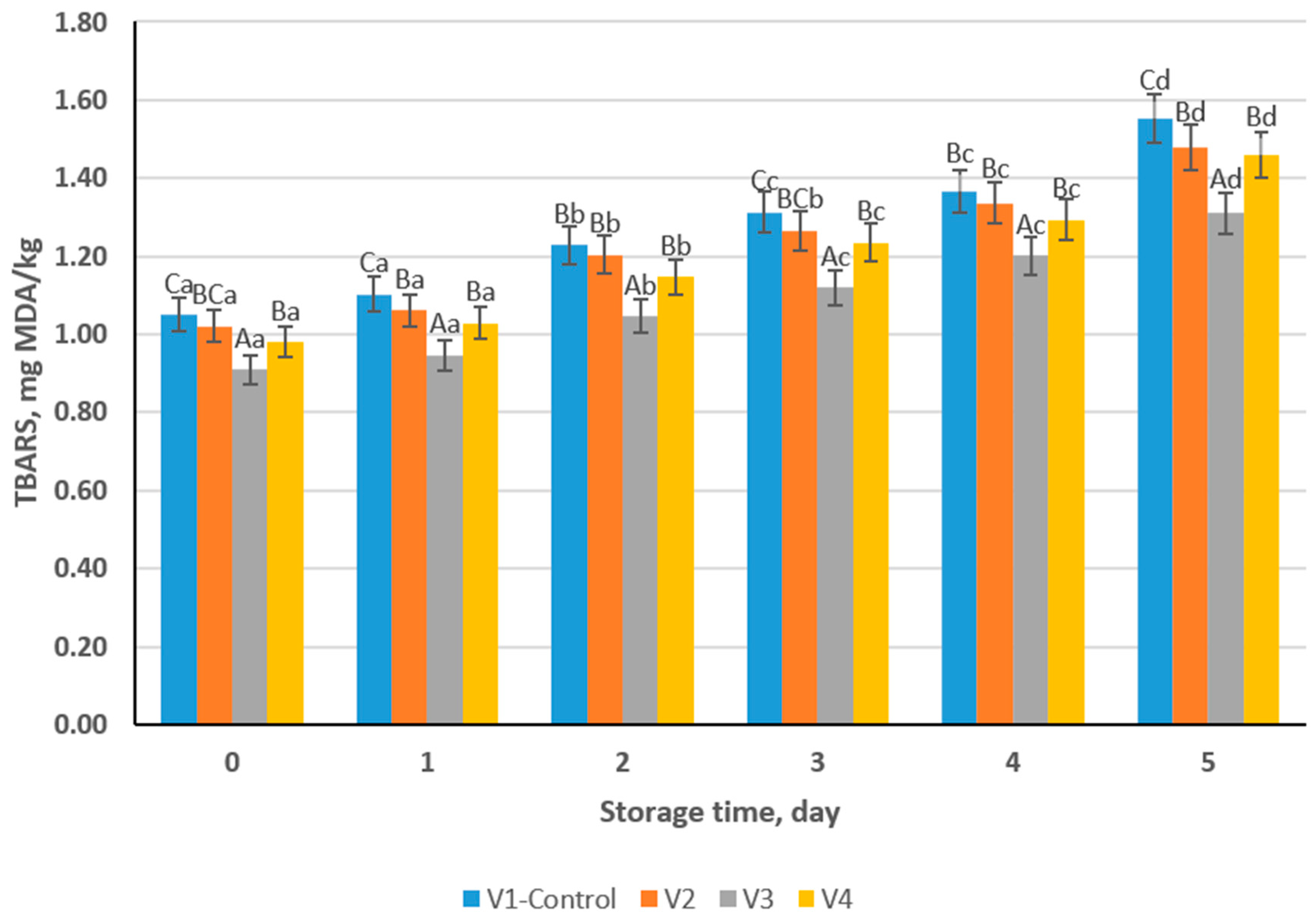 p < 0.05), and by Day 5, all supplemented formulations (1.48 in Variant 2; 1.31 in Variant 3; 1.46 in Variant 4) were significantly lower than the control’s 1.55 mg MDA/kg (