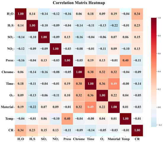Figure 4 presents a correlation heatmap matrix illustrating the pairwise Pearson correlation coefficients among key factors influencing CO2 corrosion. The color intensity and numerical values within each cell reflect the strength and direction of the linear relationships between variables, ranging from −1 to 1. Notably, parameters such as temperature (Temp), partial pressure of CO2(Pt), and concentration of H2S exhibit varying degrees of correlation with the corrosion rate (CR), while other factors including time and material composition show comparatively weaker associations. This analysis provides critical insight into multicollinearity among predictors, thereby informing feature selection for subsequent modeling efforts and enhancing the interpretability and robustness of the predictive algorithm.