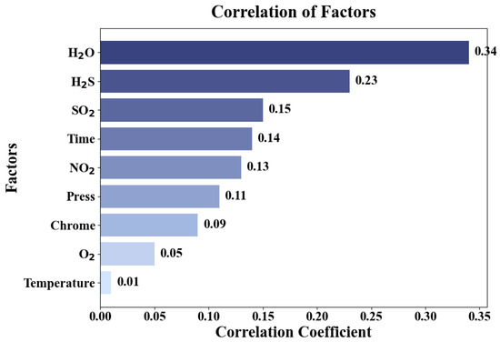 Figure 5 demonstrates the effect of different factors on the corrosion rate. The data reveal that water has the most substantial impact on the corrosion rate, with a value of 0.34, followed by hydrogen sulfide and sulfur dioxide, while temperature has a relatively minor effect. This is mainly due to water acting as a medium in the corrosion process, increasing conductivity and enhancing electrochemical reactions, thereby exacerbating the corrosion rate. Hydrogen sulfide and sulfur dioxide chemically react with the metal surface, forming sulfide protective films, which in turn affect the corrosion rate.