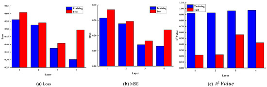 From Figure 6, it can be seen that when the number of neurons in the hidden layers is set to 6, as the number of hidden layers increases from 1 to 3, the loss and MSE gradually decrease, while the R2 value steadily increases. This is because the model is better able to capture the complex patterns and features in the data, thereby improving predictive performance. However, as the number of hidden layers reaches 4, the loss and MSE begin to rise, and the R2 value decreases. This suggests that the model might have become excessively complex, resulting in overfitting. Consequently, it performs well on the training dataset but exhibits poor performance on the test dataset.