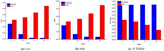 Analysis of Figure 8 shows that when the steps are set to 5, 10, 15, and 20, the loss and MSE for the training set decrease as the steps increase. The most significant reduction in loss occurs when the Steps parameter increases from 5 to 15, and it slows down from 15 to 20. The R2 value increases with the number of steps, but the change is minimal, with little difference between steps 15 and 20. However, in the test set, both loss and MSE increase as the steps increase, while the R2 value decreases. This indicates that as the steps increase, the performance on the training set improves, but the performance on the test set deteriorates, leading to overfitting. This demonstrates that more steps are not always better, and it is essential to find a balance between model complexity and generalization ability.