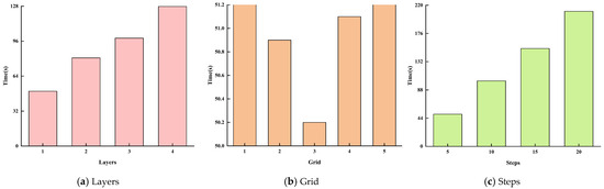 Figure 9 shows that the running time increases linearly with the number of hidden layers, ranging from 1 to 4 layers. Specifically, when the hidden layer is 1, the running time is approximately 50 s, while increasing the hidden layers to 4 results in a running time close to 128 s. A similar trend is observed with the number of steps; when the number of steps reaches 20, the running time approaches 220 s, indicating a more pronounced upward trend. In contrast, changing the size of the grid has almost no effect on the running time, with negligible differences across various grid settings.
