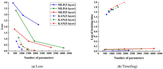 KAN and MLP are two different neural network models. MLP, short for Multilayer Perceptron, is a classic structure with multiple hidden layers, which achieves nonlinear mapping through connections and activation functions between neurons. In contrast, KAN is a relatively new structure that decomposes complex multivariate continuous functions into combinations of simple functions, thereby achieving efficient and theoretically sound nonlinear modeling. To better compare the performance of KAN and MLP, we varied the number of neurons and layers for each model and compared their losses and runtimes.