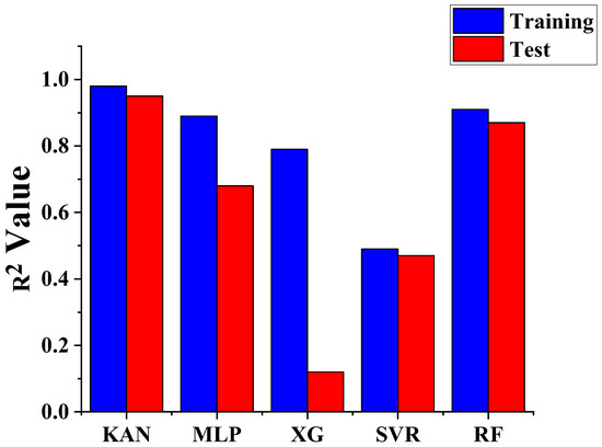 To rigorously evaluate the predictive performance and generalization capability of the models, we compared KAN, MLP, RF, XGBoost, and SVR on a held-out test set that was not involved in any training or hyperparameter tuning processes. The model performance was quantified using the Coefficient of Determination (R2), which represents the proportion of variance in the dependent variable that can be explained by the independent variables, with values closer to 1 indicating better predictive accuracy.