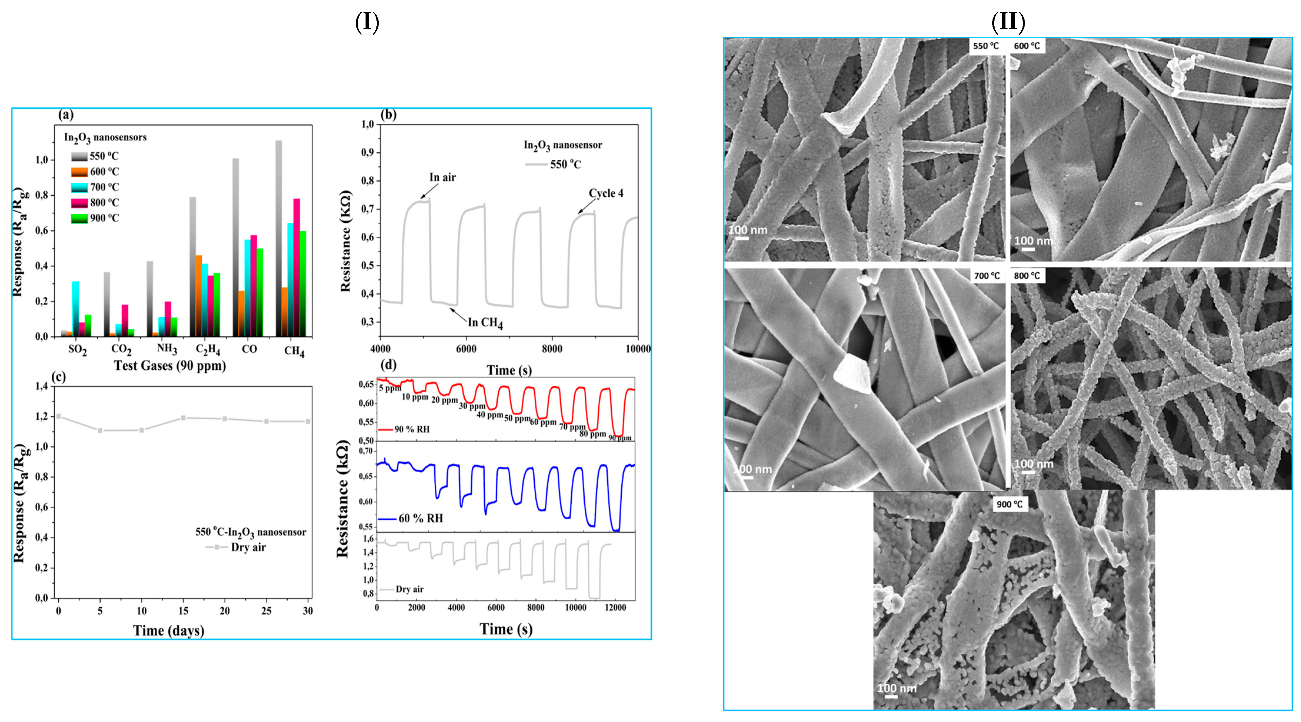 - Kgomo, M.B.; Shingange, K.; Nemufulwi, M.I.; Swart, H.C.; Mhlongo, G.H. Belt-like In2O3 based sensor for methane detection: Influence of morphological, surface defects and textural behavior. Mater. Res. Bull. 2023, 158, 112076. [Google Scholar] [CrossRef]