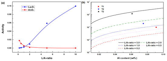 Thermodynamic calculation of the slag–steel interaction: (a) variation in slag component activity with L/A-ratio and (b) Al-La equilibrium curves varying with L/A-ratio.
