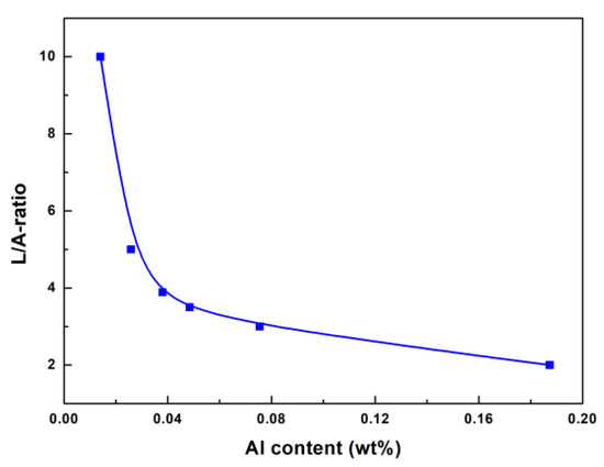 In addition, our previous work shows that the primary carbides are refined and the homogeneity of structures as well as precipitates is improved as the RE content becomes larger than 0.013 wt% [19]. As Equation (3) shows, the equilibrious relationship between Al content and activity ratio of Al2O3 to La2O3 (decided by the L/A-ratio) is certain at a given La content, namely, when the initial Al content is known and the target La content is given, the composition of slag can be clarified. Figure 2 shows the relationship between the L/A-ratio in slag and Al content in steel at the target La content of 0.013 wt%. It can be seen from Figure 2 that a high L/A-ratio is required when the Al content in steel is low. According to the thermodynamic analysis, the L/A-ratio should be higher than 3.89. It means that the La2O3 content in the 50wt%CaF2-20wt%CaO-Al2O3-La2O3 slag should be about 23.9 wt% to ensure the La treatment effect on H13 steel.