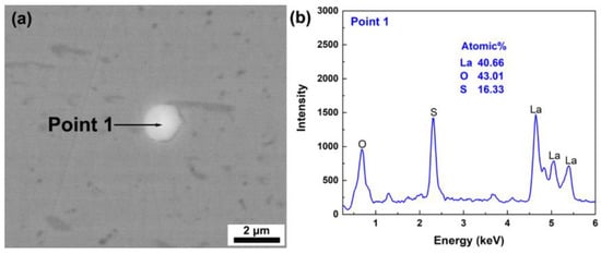Typical inclusion in raw La-containing H13 steel: (a) SEM image and (b) point-scanning results of EDS.