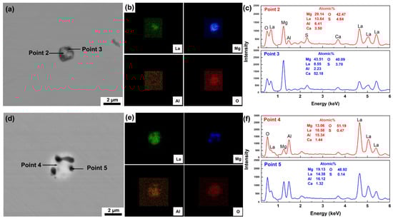 La-Mg-Al-O-S inclusions in steel after slag–steel interaction: (a–c) SEM image and EDS scanning of inclusion in T1; (d–f) SEM image and EDS scanning of inclusion in T2.