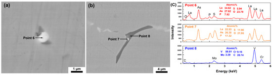 La-O-As-S-P inclusions in T3: (a) SEM image of a single La-O-As-S-P inclusion; (b) the La-O-As-S-P inclusion located in the V-rich primary carbide; and (c) EDS scanning results.