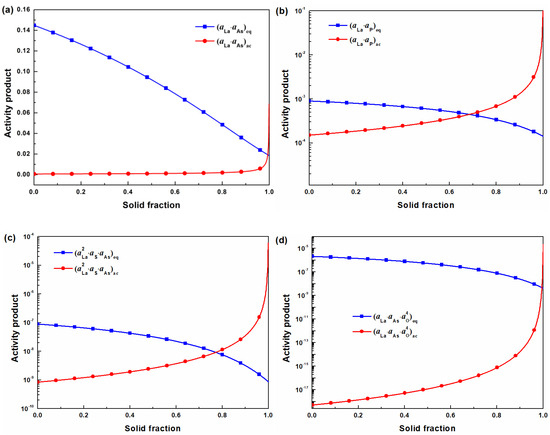 Equilibrium activity products and actual activity products of (a) LaAs, (b) LaP, (c) LaS‧LaAs, and (d) LaAsO4.