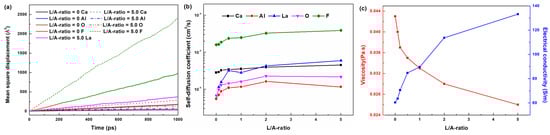 where ri(t) is the position of ion i at time t, N is the number of ions, and the angular brackets indicate an ensemble average. Figure 7a shows the MSD curves of the ions in slag with L/A-ratios of 0 and 5.0 at 1873 K, calculated based on MD simulation. For a given ion species, its self-diffusion coefficient (Ds) is calculated via Equation (16) based on the obtained MSD as follows [31,57]: