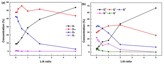 Structure evolutions of slags with varying L/A-ratio: (a) distribution of oxygen type and (b) distributions of structure unit Qn.