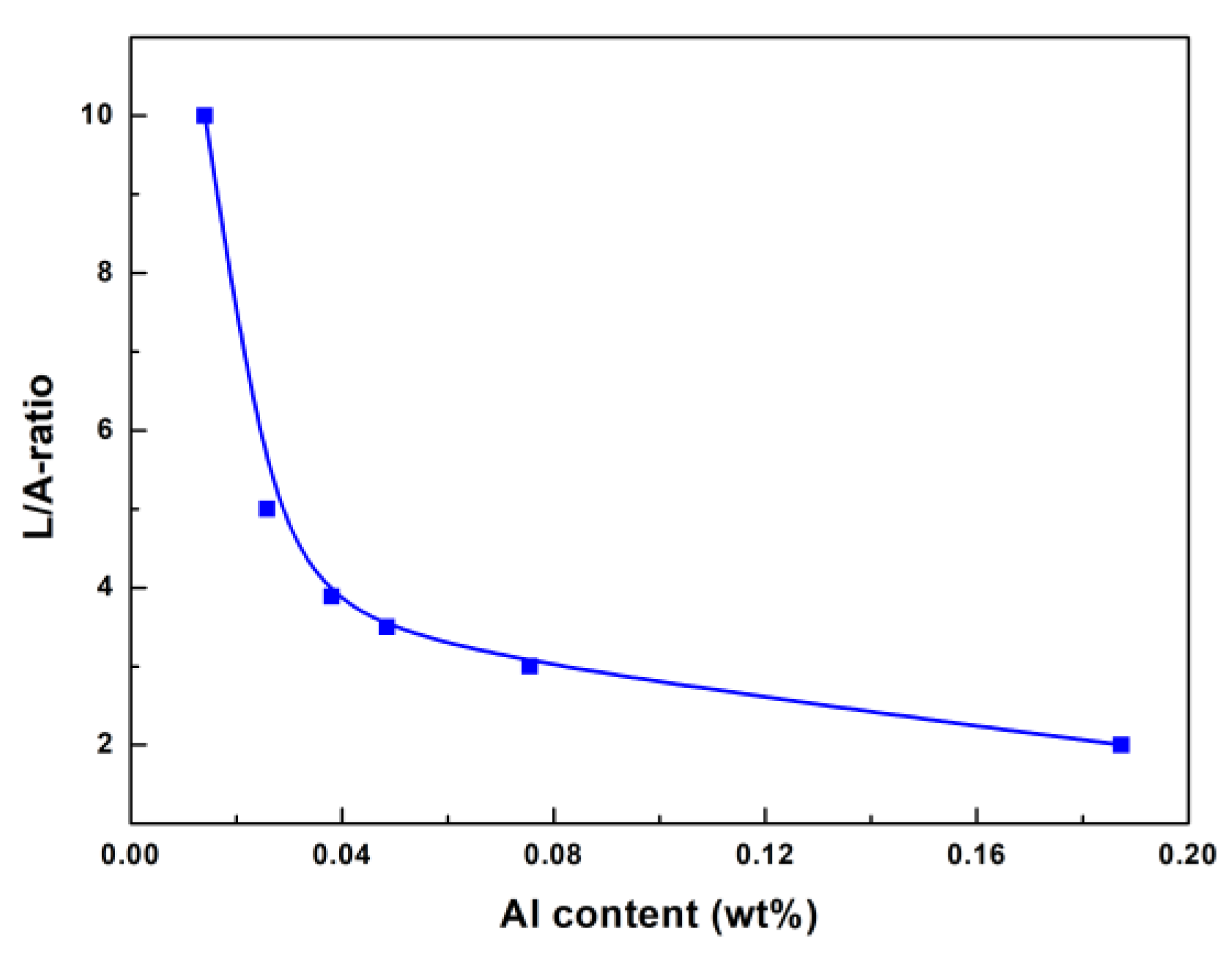 - The increase in the L/A-ratio in slag suppresses La oxidation in steel during slag–steel interactions. When L/A-ratio increases from 0.2 to 5.0, La yield increases from 5.3% to 63.2%. Thermodynamic calculation indicates that the activities of La2O3 increases with increasing L/A-ratio, whereas that of Al2O3 decreases. This further increases the equilibrium La content at a given Al content in steel and finally contributes to the increase in La yield. The La2O3 content in the 50wt%CaF2-20wt%CaO-Al2O3-La2O3 slag should be higher than 23.9 wt% to realize a desirable La-treatment effect for the investigated H13 steel.