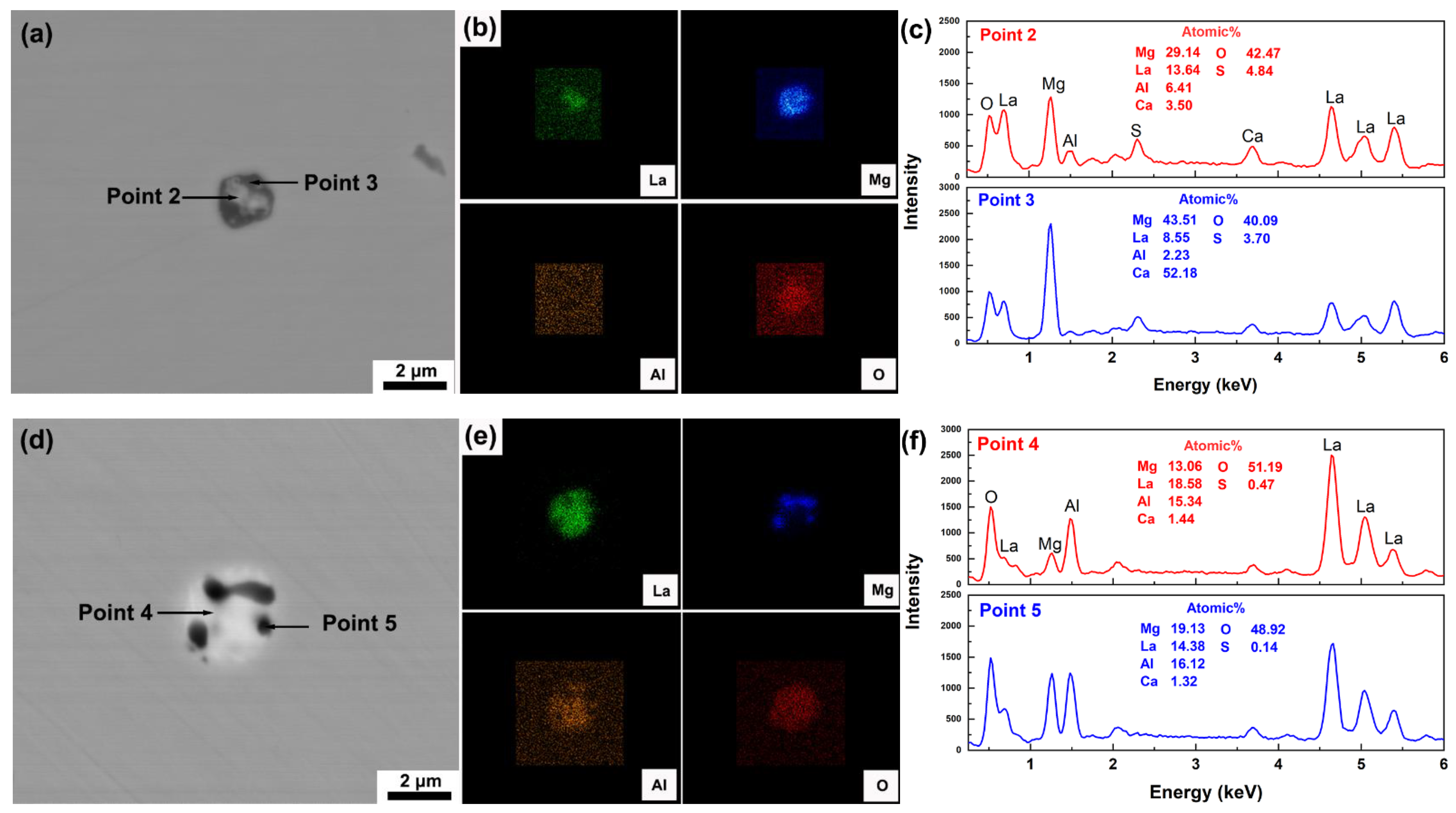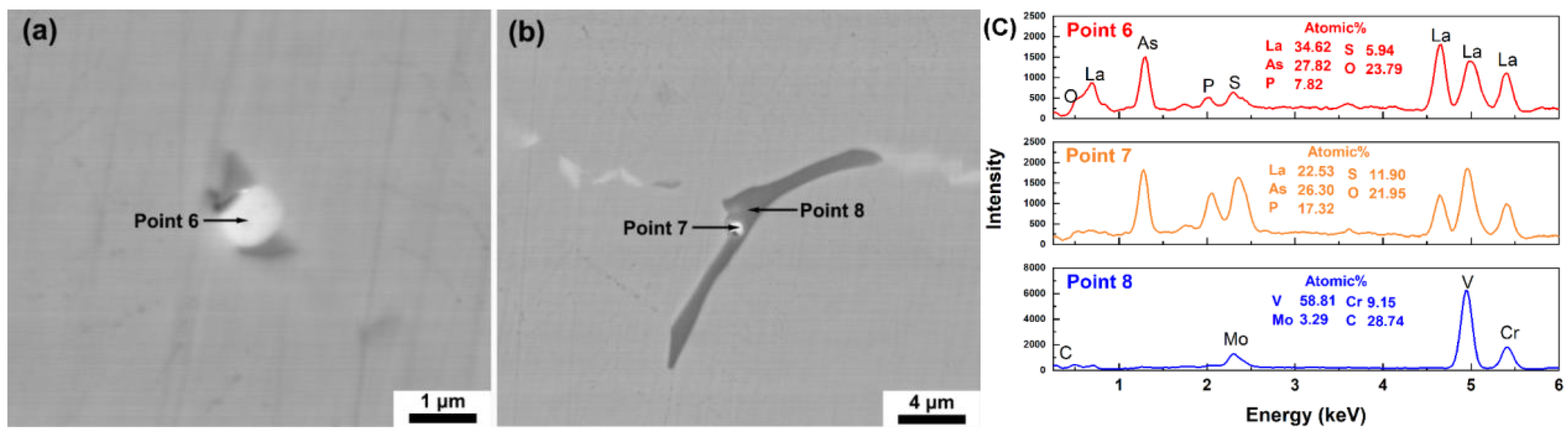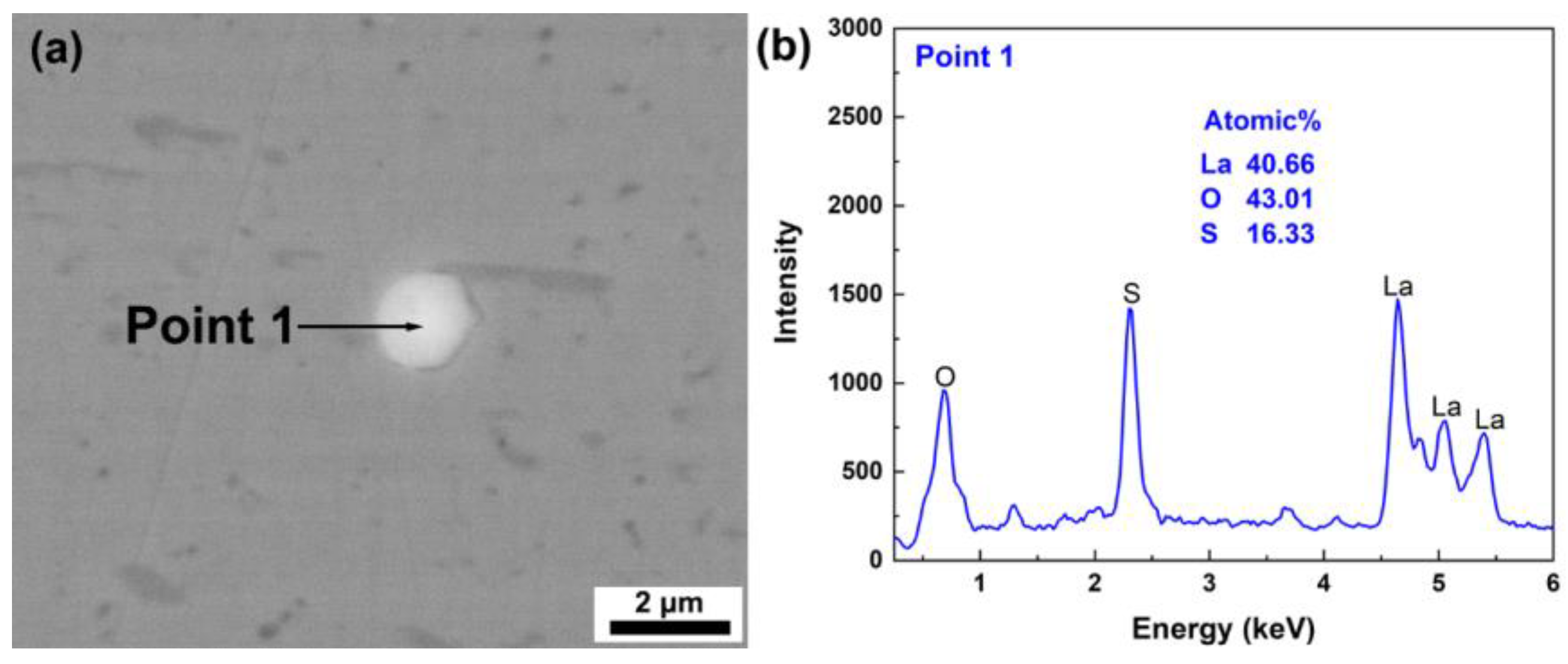 - Zheng, H.; Duan, S.; Zhang, L. Investigation of lanthanum content on nonmetallic inclusions and mechanical properties of low alloy wear-resistant steel containing P and As elements through in situ tensile test. Metall. Mater. Trans. B 2025, 56, 120–140. [Google Scholar] [CrossRef]