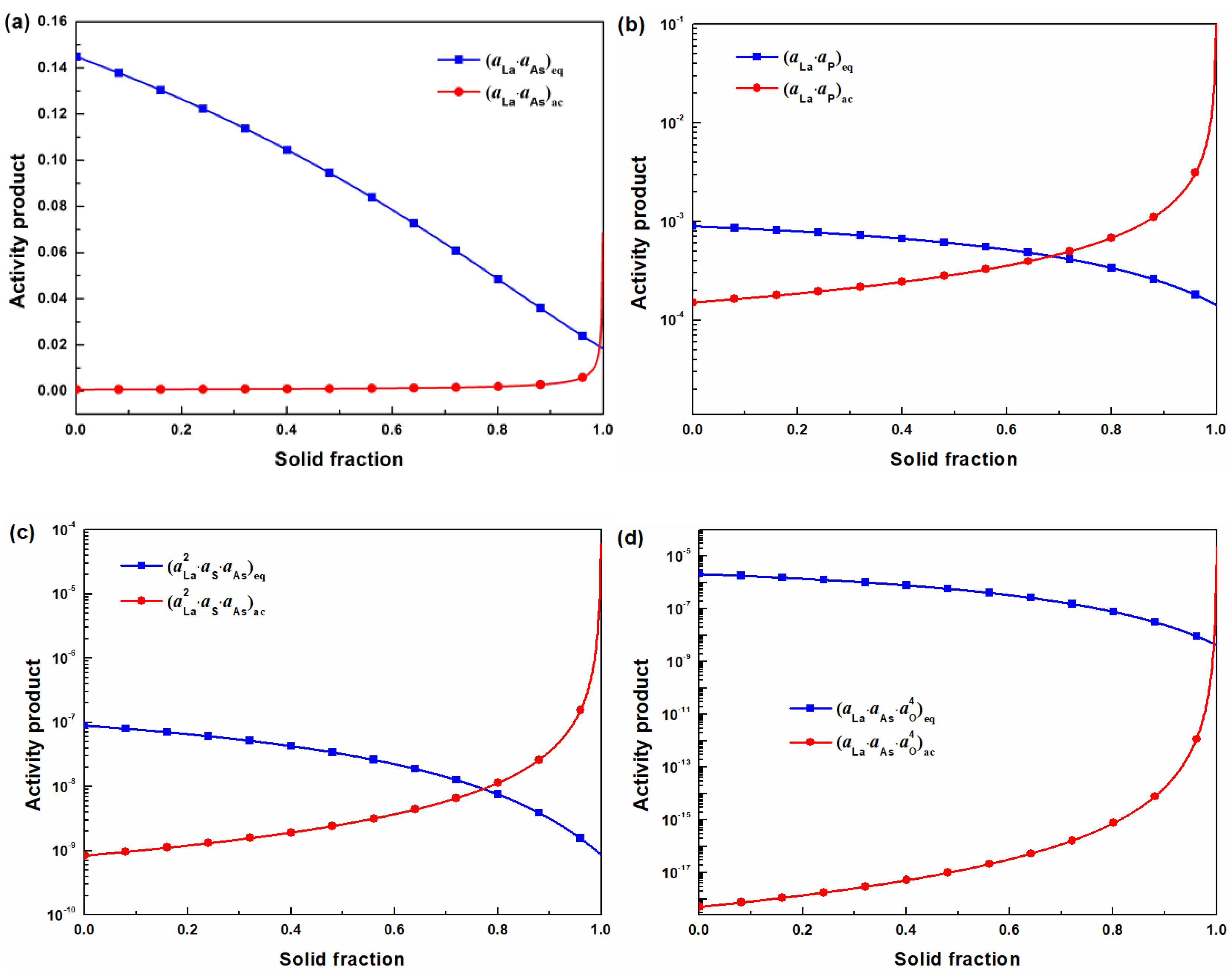- The desulfurization and deoxidation effect of slag are enhanced with increasing L/A-ratio. In addition, phosphorus and arsenic decrease when the L/A-ratio reaches 5.0. The removal rates of phosphorus and arsenic are 20.0% and 33.3%, respectively. The inclusion of La2O2S in the original H13 steel transforms into La-Mg-Al-O-S inclusions at L/A-ratios of 0.2 and 1, and changes to La-O-As-S-P inclusions when the L/A-ratio increases to 5.0. Thermodynamic calculation shows that LaP and LaS‧LaAs could be formed in the early stage of solidification as the L/A-ratio is 5.0. It provides an opportunity for the removal of phosphorus and arsenic in steel.