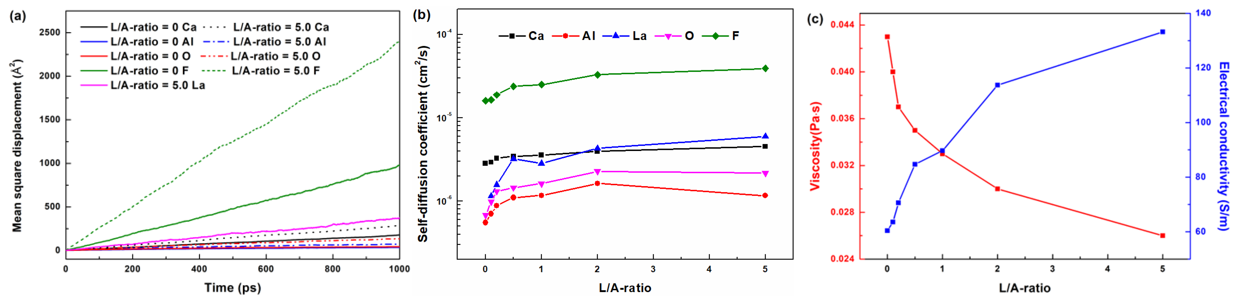 - Molecular dynamics simulation indicates that increasing L/A-ratio enhances the mobility of ions in molten slag and further decreases the viscosity as well as increases the electrical conductivity of slag. The concentration of free oxygen in slag sharply increases with the increasing L/A-ratio. This simplifies the aluminate network structure. The increase in the L/A-ratio provides better kinetic conditions for cleanliness improvement but also brings the risk of higher energy consumption.