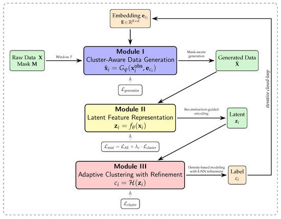 GRAIL, in contrast to approaches that separate representation learning and clustering, performs a unified, end-to-end optimization. Each experiment consists of 20 outer iterations, with each iteration comprising three sequential stages. In the first stage, An LSTM-based recurrent neural network reconstructs missing values within fixed-length input windows of 32 time steps. To make the generation cluster-aware, each sequence is augmented at every time step with a trainable 8-dimensional embedding corresponding to its current cluster identity. Specifically, a discrete label is mapped via an embedding table to a vector , which is then fed to the generator. A binary mask distinguishes observed from missing entries, and the network is trained for 10 epochs using a masked mean squared error objective to optimize only the imputed values. In the second stage, the imputed sequences are processed by an autoencoder, which projects the inputs into a 10-dimensional latent space. The autoencoder is trained for 10 epochs per iteration using a composite loss that balances reconstruction fidelity with a cluster-consistency regularizer. This regularizer encourages samples from the same cluster to form compact regions in the latent space. Crucially, network parameters are preserved across iterations, allowing for progressive refinement of the latent structure. In the third stage, HDBSCAN is applied to the latent embeddings to partition the data. A grid search over 20 candidate values for the minimum cluster size, logarithmically spaced between 0.1% and 50% of the dataset size, is performed to accommodate clusters of varying density. Finally, to improve assignment coverage, a 5-nearest-neighbor majority vote is used to reassign any points initially labeled as noise.