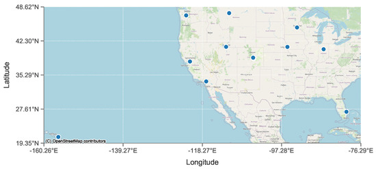 Figure 2, the sites span a broad geographic range from approximately 160° W to 76° W longitude and 19° N to 48° N latitude, encompassing diverse coastal, island, and inland settings. Each observation contains 17 raw features, including meteorological covariates like humidity, ambient temperature, wind speed, visibility, surface pressure, and cloud ceiling, which exhibit wide variability, as shown in