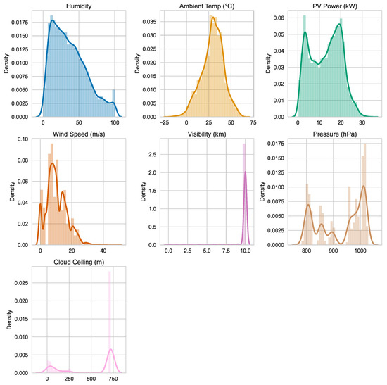 Table 1. The start and end timestamps of data collection vary significantly among locations, reflecting differences in sensor deployment timelines and operational stability. To mitigate this temporal misalignment and ensure consistent coverage, a common subwindow from 1 December 2017 10:00:00 to 1 June 2018 15:00:00 is selected, yielding a dataset of 7192 hourly observations. The statistical distribution of this final dataset, shown in