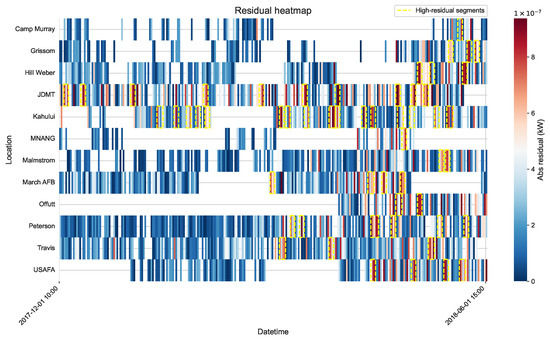 Figure 6 presents a sequence-tile residual heatmap. Each row in the heatmap corresponds to a PV site and each column represents an hourly timestep, with the color encoding the absolute difference between observed and reconstructed power values. The residuals are predominantly concentrated in the deep-blue region, indicating that the generation module in GRAIL consistently captures the underlying temporal dynamics of PV output with high precision. For example, sites such as Camp Murray, Hill Weber, and Malmstrom display uniformly low reconstruction errors across all timestamps, demonstrating the model’s ability to capture site-specific PV power dynamics with high consistency. Although locations such as JDMT and Kahului exhibit more frequent and longer high-residual segments, as highlighted by the dashed yellow boxes in