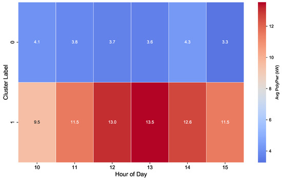 Figure 7 visualizes the average hourly photovoltaic power output between 10:00 and 15:00 for the identified groups. The resulting partition reveals two clearly distinct clusters that correspond to low-generation and high-generation scenarios. Cluster 0 is characterized by a suppressed generation profile, with its output remaining consistently below 4.5 kW. The average output begins at 4.1 kW at 10:00 and declines to 3.3 kW by 15:00. This flat trajectory is indicative of persistent atmospheric attenuation from conditions such as overcast skies or heavy cloud cover. In contrast, Cluster 1 follows a distinct bell-shaped generation curve characteristic of clear-sky conditions. Its power output starts at 9.5 kW, peaks at 13.5 kW around solar noon, and gradually declines to 11.5 kW. The generation amplitude of this cluster is approximately three times that of Cluster 0, which suggests optimal irradiance-to-power conversion efficiency. The distinct separation between the two profiles highlights the model’s capacity to preserve salient structural patterns during the generation and clustering processes. Furthermore, the hour-to-hour profiles within each cluster are nearly parallel, a feature that reflects low intra-cluster variability and high internal consistency. This visual observation aligns with the elevated silhouette scores from