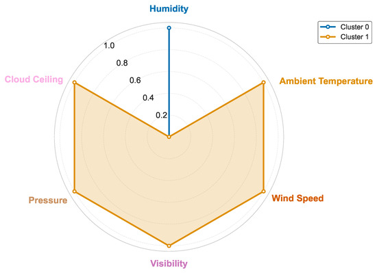 range for comparability. The two clusters display remarkably divergent environmental characteristics. Cluster 0, indicated by the blue trace, is predominantly characterized by high relative humidity, a condition representative of overcast or saturated settings that attenuate incoming solar radiation and inhibit photovoltaic performance. In contrast, Cluster 1, indicated by the orange trace, exhibits high normalized scores across ambient temperature, wind speed, visibility, surface pressure, and cloud ceiling. These indicators correspond to clear-sky, dry, high-pressure conditions that are conducive to maximized solar insolation. The complementary environmental properties of the two clusters are consistent with their power generation profiles, which show a difference of approximately 9 kW. As evidenced by