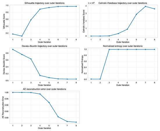 Figure 9 illustrates the convergence behavior of GRAIL’s alternating optimization, with key clustering metrics stabilizing rapidly. The silhouette score shows a steep ascent from 0.13 at iteration 2 to over 0.9 by iteration 4, after which it saturates. This early stabilization indicates that the latent space quickly organizes into compact, well-separated clusters. A comparable trend is observed in the Calinski-Harabasz index, which rises by three orders of magnitude between iterations 5 and 7, suggesting a continued refinement of inter-cluster dispersion even after the initial structure is formed. Inversely, the Davies-Bouldin index exhibits a steady decay, falling below 0.05 by iteration 6, which corroborates the reduction in cluster overlap. Other metrics provide further insight into the training dynamics. The normalized entropy experiences an abrupt increase at iteration 3 and remains at its theoretical maximum, indicating that the sample distribution across clusters becomes balanced early and remains stable. Concurrently, the autoencoder’s reconstruction error remains nearly constant during the initial iterations and only begins to decrease after iteration 5. This delay suggests a strategic shift in the model’s learning process. Once the global cluster geometry stabilizes, GRAIL reallocates its capacity toward refining the localized reconstruction of data, improving generation quality without compromising structural clarity. These patterns demonstrate the computational efficiency of GRAIL. The framework achieves convergence within approximately six outer iterations, dramatically reducing the training cost compared to typical deep clustering models. This accelerated optimization not only improves scalability but also enhances the model’s responsiveness for real-world settings where training budgets may be limited.