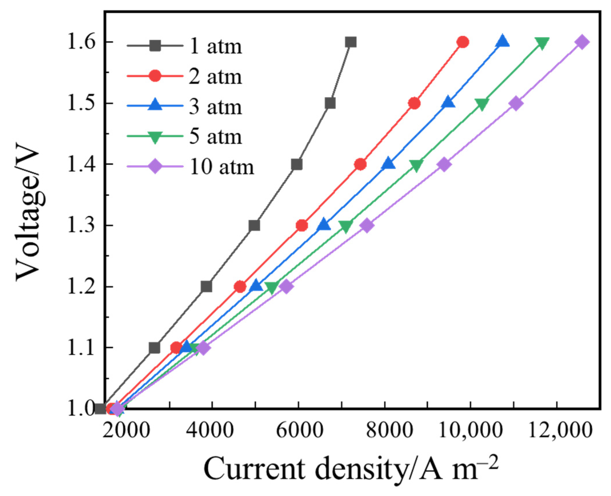 - Du, Y.; Qin, Y.; Zhang, G.; Yin, Y.; Jiao, K.; Du, Q. Modelling of effect of pressure on co-electrolysis of water and carbon dioxide in solid oxide electrolysis cell. Int. J. Hydrogen Energy 2019, 44, 3456–3469. [Google Scholar] [CrossRef]