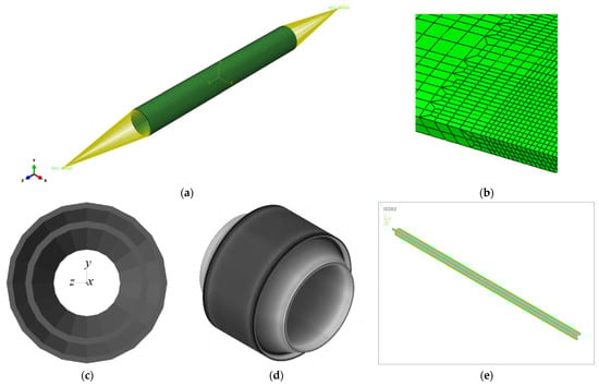 Finite element model. (a) Single-pipe model; (b) Detailed drawing of wall thickness (encryption of connection positions); (c) Double-pipe model; (d) Connection construction model; (e) Constraint conditions and connection units.