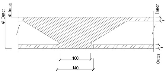 Both the inner and outer pipes are made of 16 Mn steel. The material properties include a Young’s modulus of 2.07 × 1011 N/m2, density of 7850 kg/m3, thermal expansion coefficient of 1.17 × 10−5/°C, and Poisson’s ratio of 0.3. The main geometric and mechanical parameters are listed in Table 2. Constant mechanical properties were adopted for all simulations. This choice is justified by the relatively narrow temperature variation range in deepwater service conditions (approximately −18~65 °C), within which the temperature-induced variation in steel properties such as Young’s modulus and yield strength is minimal [32,33]. Neglecting such minor variations does not significantly affect stress distribution analysis in steel pipelines. Therefore, the use of constant properties provides a reasonable simplification that allows for clearer focus on the combined effects of internal pressure and temperature-induced expansion.