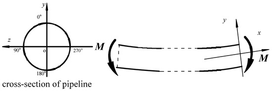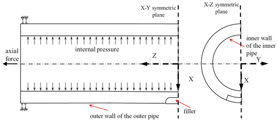 Symmetrical displacement boundary conditions are adopted on the X-Y plane and the X-Z plane. The displacement of the nodes on the end section in the X and Y directions is restricted, and the pipe end is only allowed to move in the Z direction. All boundary conditions are shown in Figure 5.