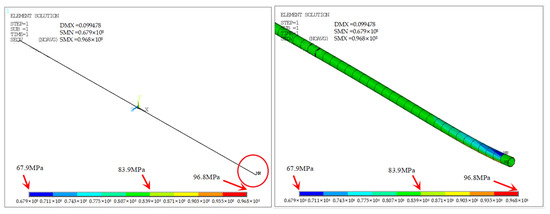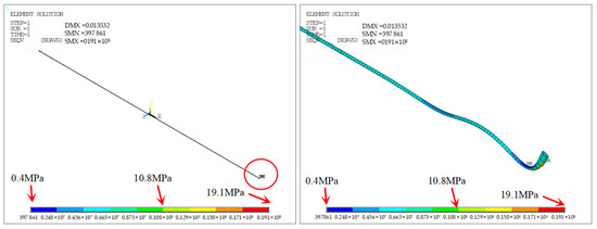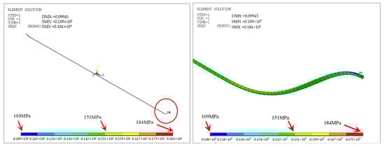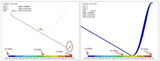 Equivalent stress distribution of inner pipe with Extreme Condition I (unit: Pa). (Note: The detailed image of the red area on the left is shown in the figure on the right. ‘DMX’ is the ‘Maximum deformation’, ‘SMN’ is the ‘Minimum stress’, and ‘SMX’ is the ‘Maximum stress’. (The same below)).