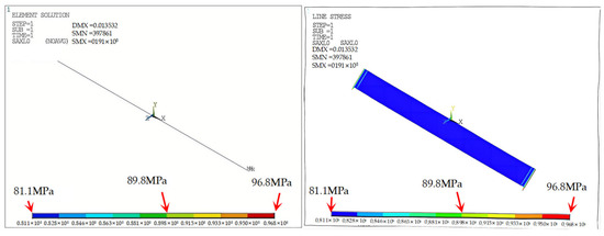 Figure 7 presents the equivalent stress distribution in the outer pipe under the same extreme condition. The deformation of the inner pipe, caused by both thermal and pressure loads, transmits force to the outer pipe at the end joints, thereby inducing stress in the outer structure. In most regions of the outer pipe body, the equivalent stress ranges between 80.7 MPa and 83.9 MPa. However, pronounced stress gradients appear near the ends due to the reactive forces exerted by the inner pipe. At the bottom of the pipe end (“−y” direction), the maximum stress reaches 96.8 MPa, while at the top of the pipe end (“+y” direction), the minimum stress drops to 67.9 MPa.