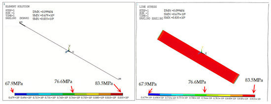 Figure 8 illustrates the equivalent stress distribution in the inner pipe under this thermal contraction scenario. As the inner pipe contracts due to temperature-induced shrinkage, internal pressure concurrently induces axial and circumferential tensile stresses. Additionally, the inner pipe exhibits vertical displacement due to gravitational forces, resulting in a bowl-shaped deformation similar to that described previously. Under the combined action of thermal and internal pressure loads, most regions of the inner pipe (excluding the end sections) experience stress in the range of 52 MPa to 54 MPa. Stress concentrations occur at the pipe ends, with the minimum equivalent stress reaching 52 MPa in the “−y” direction (bottom of the pipe end) and a maximum of 70.5 MPa in the “+y” direction (top of the pipe end).