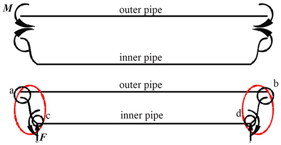 The pronounced stress concentrations near the pipe ends, with a maximum of 19.1 MPa at the top (“+y” direction) and a minimum of 0.4 MPa at the bottom (“−y” direction), reflect the combined effects of vertical displacement of the inner pipe due to gravity and the reactive axial and bending forces transmitted to the outer pipe. This asymmetric stress pattern demonstrates that the outer pipe’s structural integrity is most challenged near the ends, suggesting that reinforcement or careful joint design is critical in these regions to accommodate axial and bending interactions.