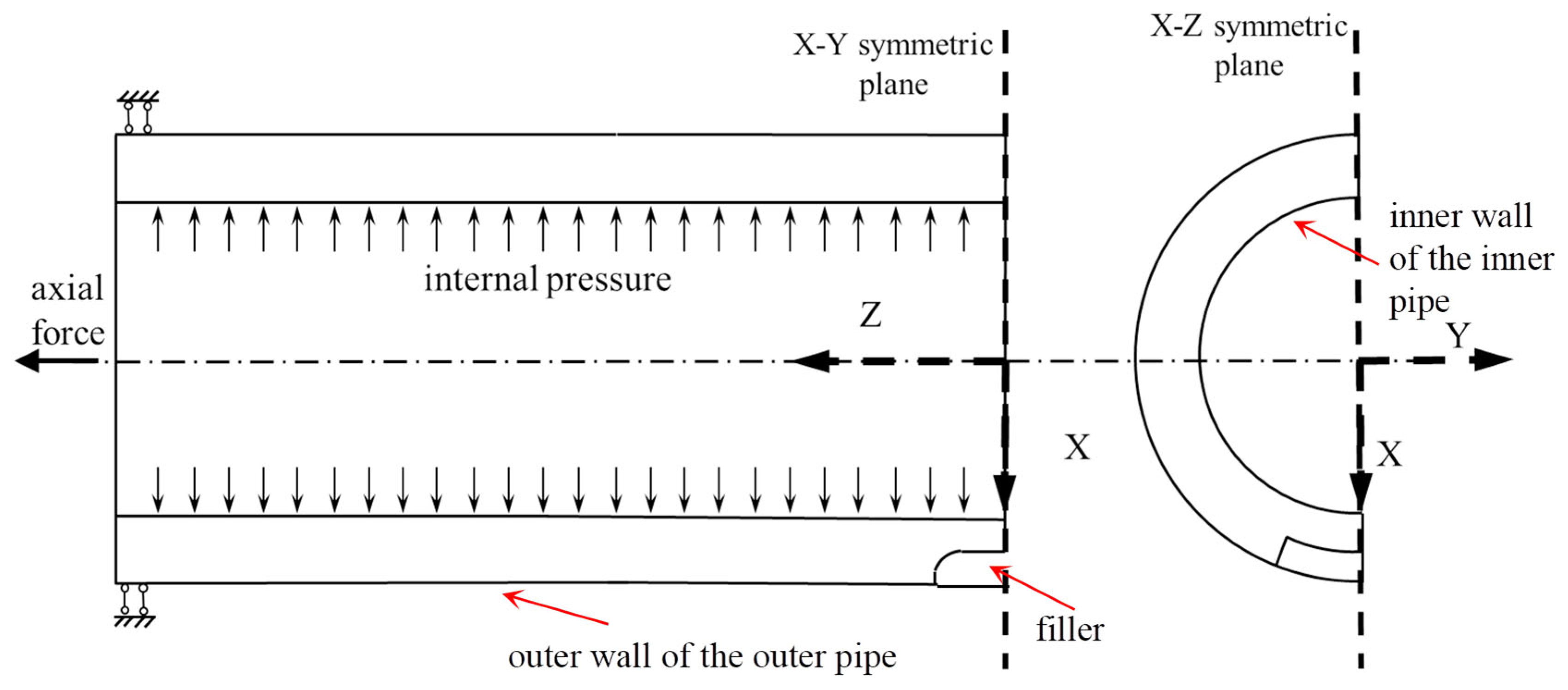 Mz) occurs. The bending moment is caused by the differential deformation of the inner and outer pipes and the internal pressure.