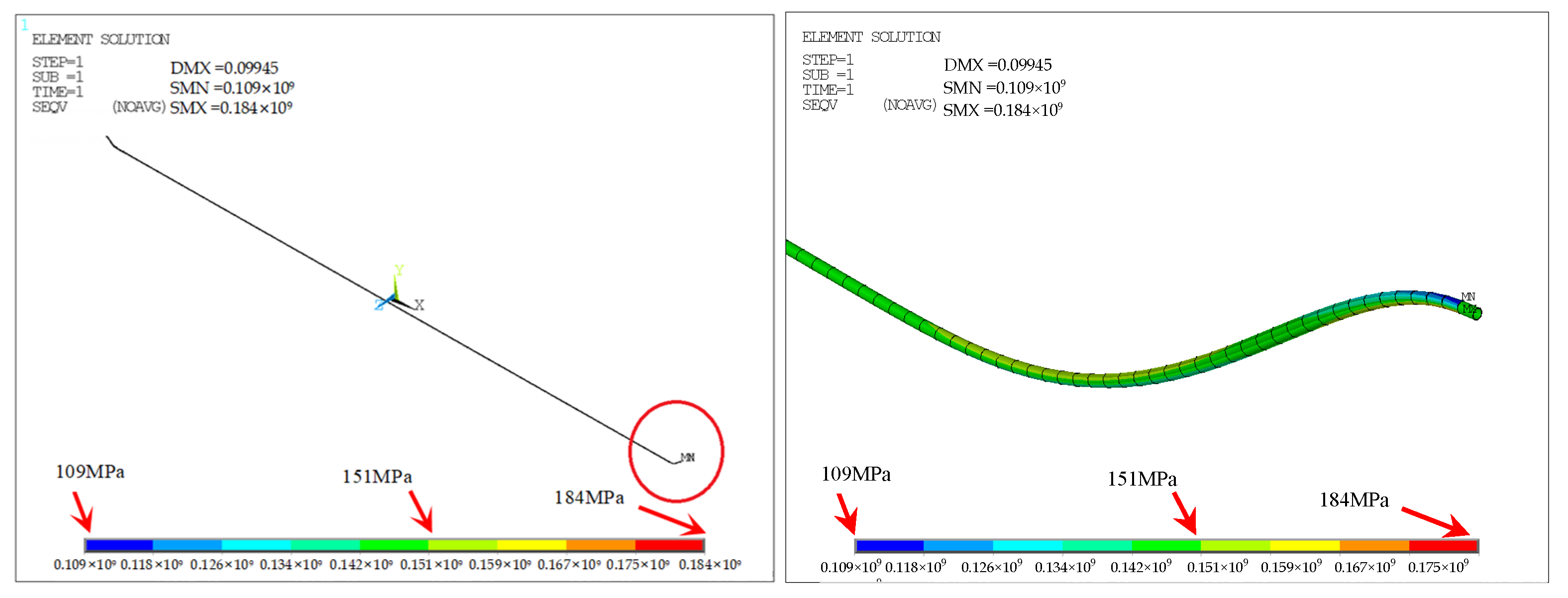 Figure 21 represent the stress-affected zones arising from the mechanical interaction between inner and outer pipes. Beyond these areas, the remaining pipe segments are largely unaffected by the end bending moments, and the stress fields remain stable.