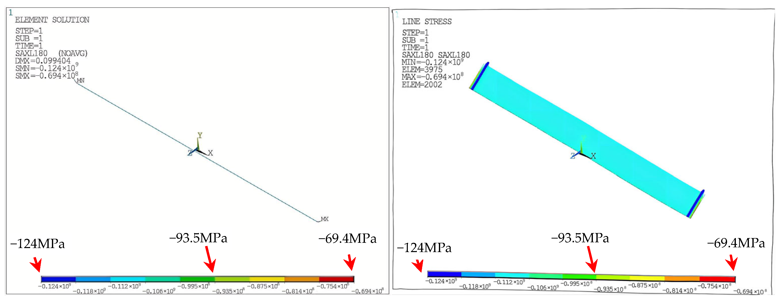 Thermal stress with free expansion is computed as σ’t = αEΔT = 206 MP, corresponding to a free elongation of Δl = αLΔT =0.498 m. Accounting for constrained displacement of 0.09945 m, the effective thermal stress is: σt = σ’t × (1 − 0.09945/0.498) = 124 MPa. Given a measured Poisson’s ratio of 0.26, the axial stress due to Poisson’s effect is σa = μσh = 14.82 MPa. Since Poisson and thermal stresses act in opposite directions, the net axial stress is: σi =σt − σa = 109.18 MPa according to Equation (2). This matches the FEM result with only 0.06% error, confirming the validity of Equation (4).