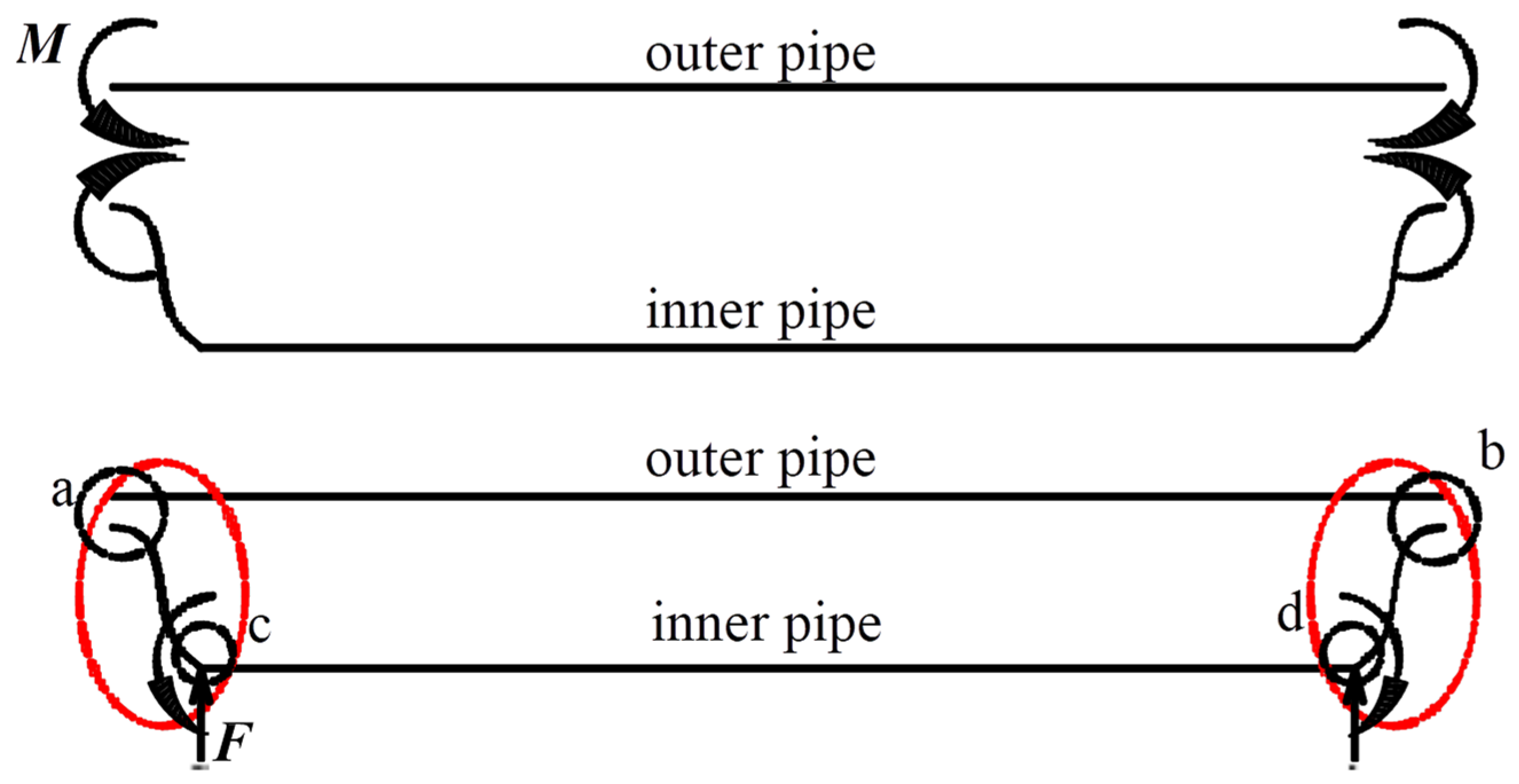 The middle sections of the outer pipe are not affected by external loads at the ends because these forces are absorbed by the end constraints. Similarly, the middle section of the inner pipe remains unaffected due to the L-shaped deformation at both ends, where points c and d act as pivot supports that neutralize external loads through reaction forces.