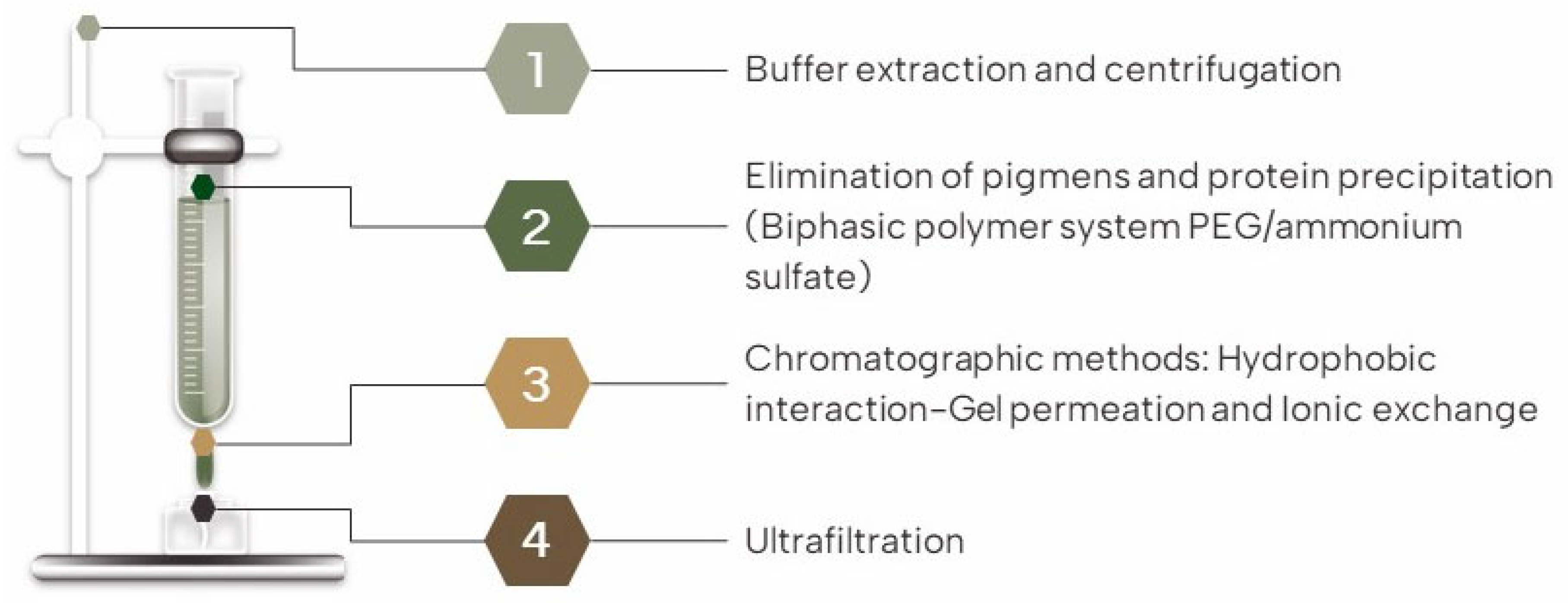 The purification of PODs from Colombian tropical plants has yielded promising results, with several species demonstrating high enzymatic activity. Among these, the leaves of the royal palm have proven to be a particularly rich source of POD, leading to the isolation of a novel enzyme with high purity. The purification process for this POD involved several key steps. Initially, the palm leaves were homogenized, and ammonium sulfate ((NH4)2SO4) precipitation was used to concentrate the enzyme while removing unwanted proteins [47]. Following this, colored compounds were extracted to reduce interference during the purification process. The enzyme was then subjected to successive chromatographic steps, including hydrophobic interaction chromatography on Phenyl-Sepharose, size-exclusion chromatography using Sephacryl S100 (Cytiva, Marlborough, MA, USA), and ion-exchange chromatography on DEAE-Toyopearl. This multi-step process resulted in a highly purified peroxidase with a specific activity of 6170 U/mg. Similarly, PODs from the leaves of guinea grass have been isolated and partially purified using a biphasic polymer system consisting of polyethylene glycol (PEG) and ammonium sulfate [26]. This method allowed for an efficient separation of peroxidase from other proteins, followed by size-exclusion chromatography and ultracentrifugation to obtain a highly active and homogeneous enzyme preparation. In another approach, sweet potato peels were utilized as a POD source [20]. The purification protocol involved homogenization, removal of pigments, and subsequent chromatographic steps using Phenyl-Sepharose and DEAE-Toyopearl columns. This method produced sweet potato peroxidase (SPP) of high purity. Figure 3 shows a schematic representation of the basic stages in the purification of PODs extracted from Colombian plants. These methods underscore the versatility of purification strategies for plant PODs, highlighting the success of using both traditional and innovative techniques to achieve highly purified enzyme preparations from diverse plant sources.