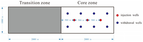 To investigate formation pressure evolution during multi-cycle injection–withdrawal operations, we developed a simplified geological model reflecting the storage facility’s normal operating conditions. Considering that the narrowest section of the S4 transition zone measures 2000–3000 m in the field, we set the model’s transition zone length to 2000 m and constructed a linear composite stratigraphic model. The model consists of two homogeneous units—each 2000 m long and 1000 m wide—representing the core zone and the transition zone, respectively, with closed external boundary conditions. To ensure effective mobilization of the low-permeability reservoir, three injection wells are placed in the core zone (one located at the boundary, 500 m from the transition zone), and eight withdrawal wells are evenly distributed around these injectors (Figure 2).