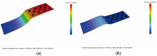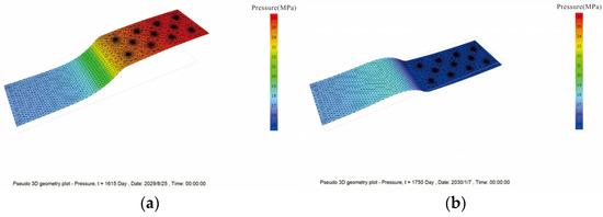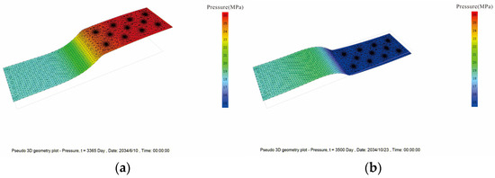 Formation pressure field map at end of tenth injection–withdrawal cycle. (a) End of gas injection; (b) end of gas withdrawal.