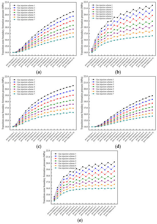 Impact of different injection schedules on formation pressure at transition zone boundary. (a) Formation assemblage 1; (b) formation assemblage 2; (c) formation assemblage 3; (d) formation assemblage 4; (e) formation assemblage 5.