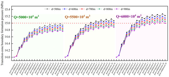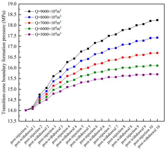 By stepwise reducing the total injection and withdrawal volume per cycle from 9000 × 104 m3 to 5000 × 104 m3, the simulation results presented in Figure 11 show that for total injection and withdrawal volumes of 9000 × 104 m3, 8000 × 104 m3, 7000 × 104 m3, 6000 × 104 m3, and 5000 × 104 m3, the transition zone boundary pressures after ten injection–withdrawal cycles are 18.24 MPa, 17.42 MPa, 16.70 MPa, 16.11 MPa, and 15.70 MPa, respectively. These results indicate that as the total injection and withdrawal volume per cycle decreases, the reduction rate of boundary pressure in the transition zone also decreases. Specifically, lowering the total injection and withdrawal volume per cycle from 9000 × 104 m3 to 5000 × 104 m3 reduces the magnitude of the transition zone pressure rise by 60%.