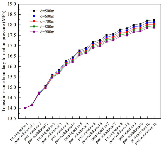 For boundary injection well distances (d) of 500, 600, 700, 800, and 900 m from the transition zone, the transition zone boundary pressures are 18.24 MPa, 18.13 MPa, 18.03 MPa, 17.95 MPa, and 17.87 MPa, respectively. These results show that increasing the distance between the boundary injection well and the transition zone has only a minor effect on transition zone boundary pressure; when d increases from 500 m to 900 m, the pressure rise magnitude at the transition zone boundary decreases by only 8%.