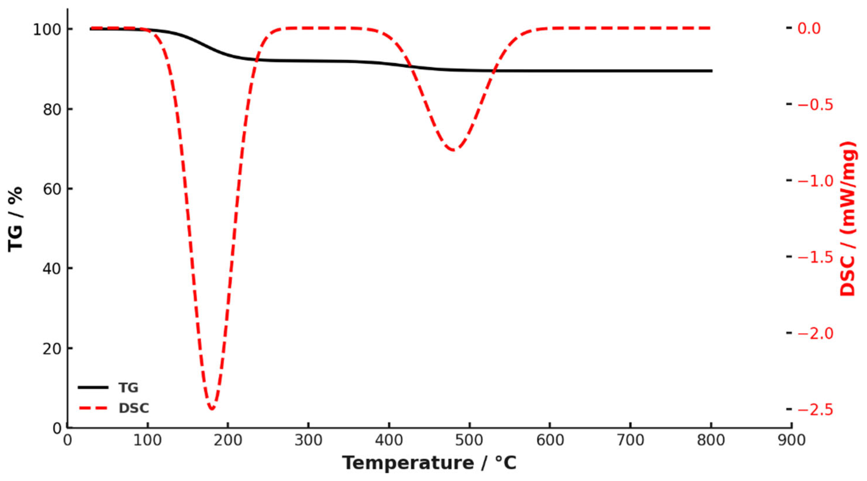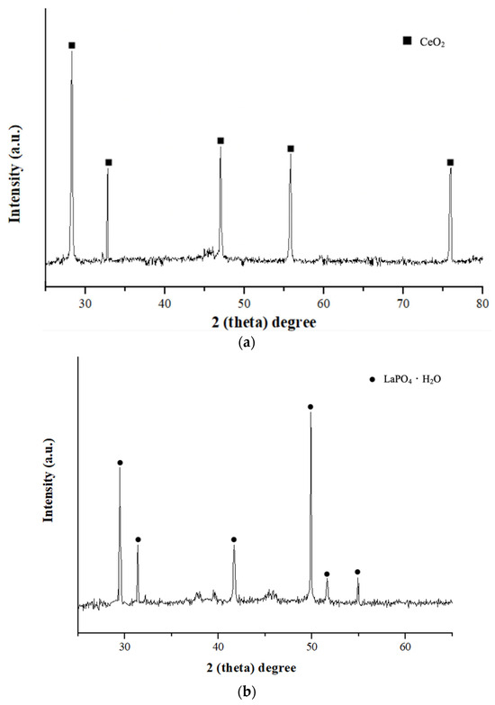 - Cerium step. The pH was adjusted to 2.7–2.8 with 1 M NaOH added dropwise (≤1 mL/min) at 25 ± 2 °C under stirring at 400 rpm. No phosphate was added at this point. A single dose of 30% H2O2 was introduced in ~1000-fold molar excess relative to the dissolved Ce. The suspension was stirred for 30 min while maintaining the pH within 2.7–2.8, followed by an additional 30 min of aging; a persistent pale-yellow coloration indicated oxidation of Ce3+ to Ce4+. The precipitate was separated by filtration, washed with 0.01 M H2SO4 and distilled water, and dried at 60 °C.